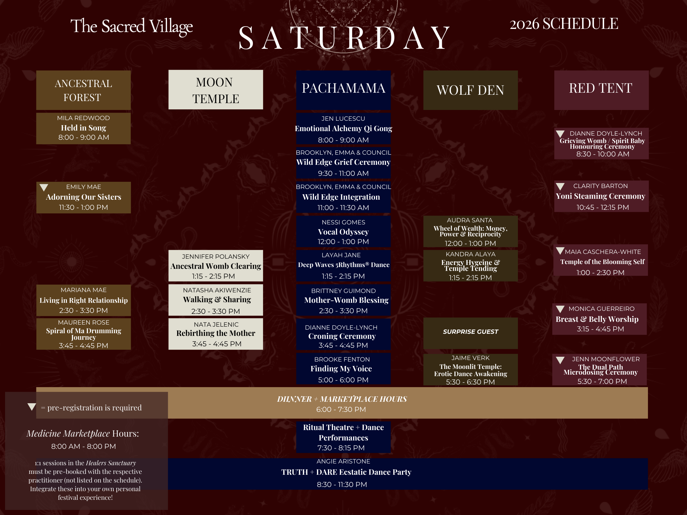 2026 SCHEDULEOur schedule is curated with intention and spaciousness— designed to guide you throughout the weekend with ease, offering a compass while allowing the natural flow of the Village to lead you.